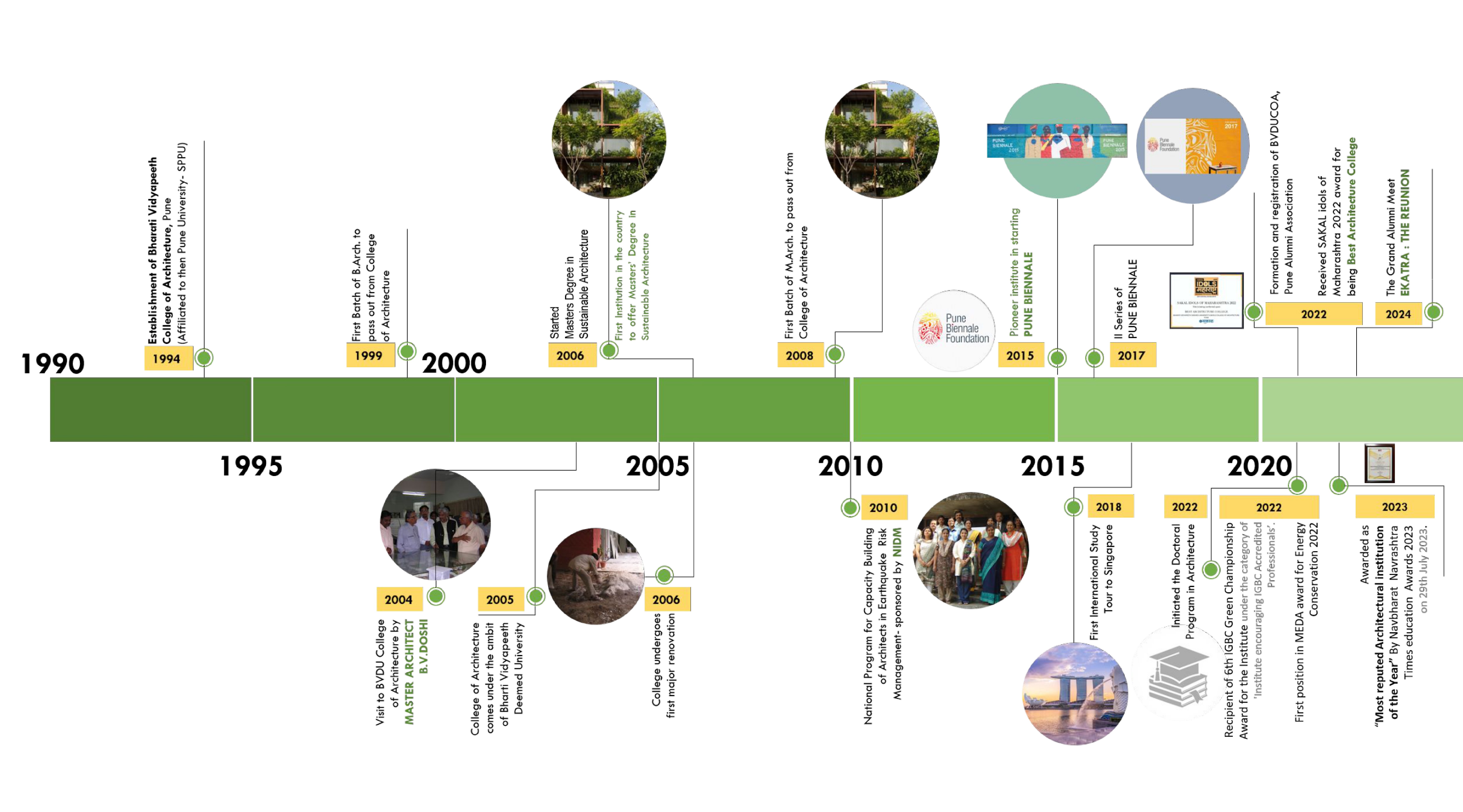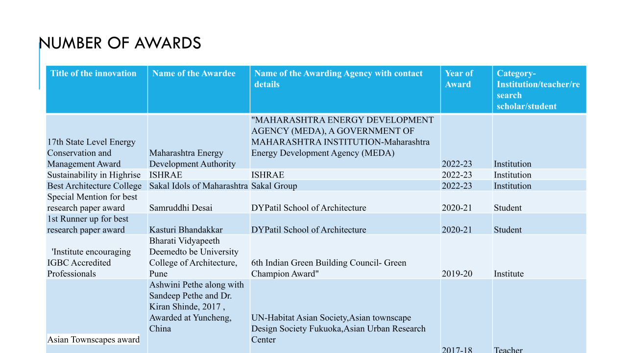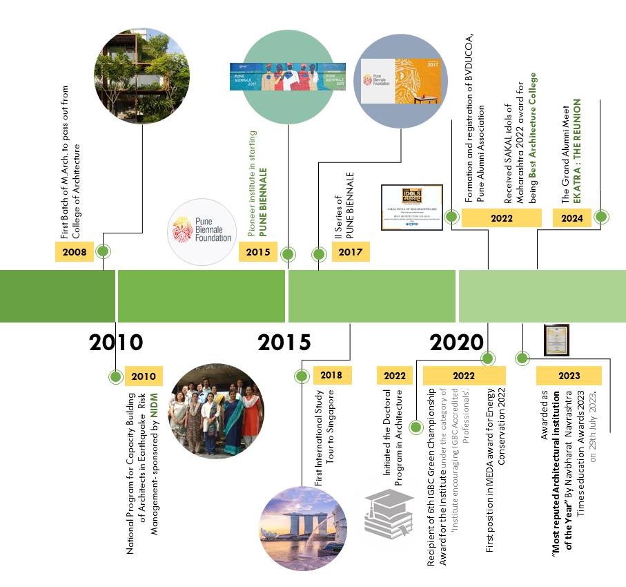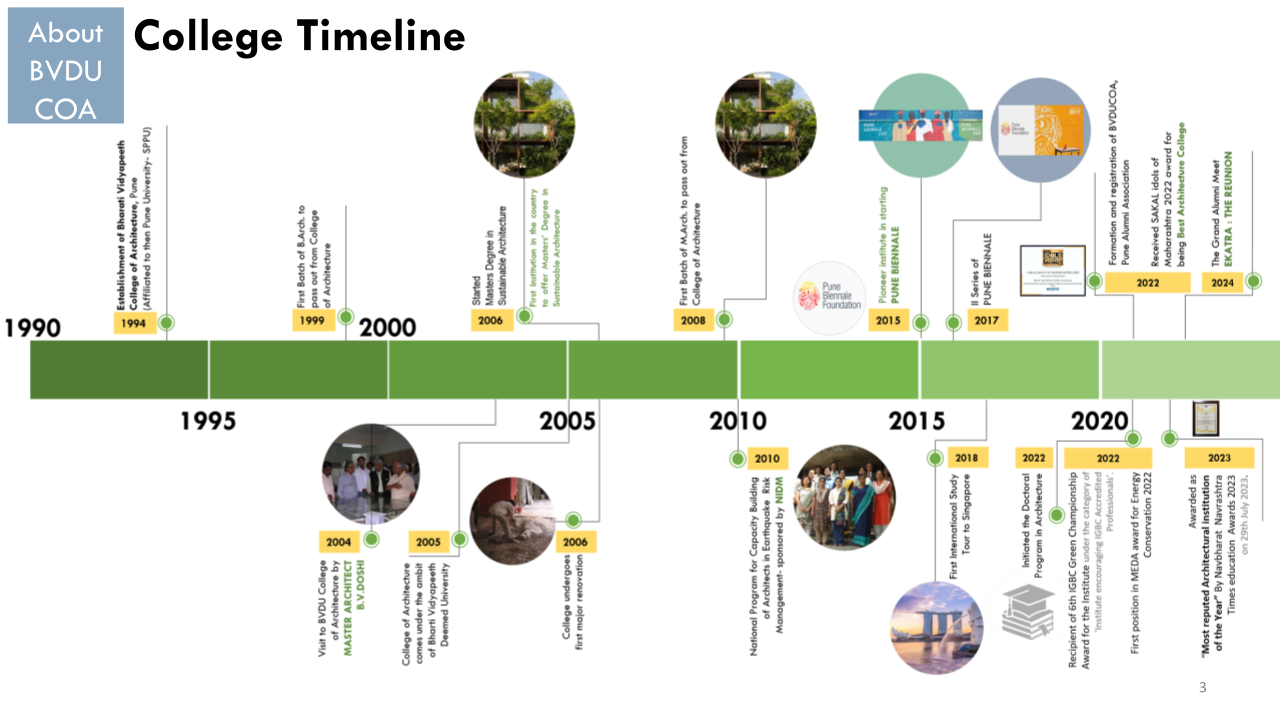 BVDUCOA in its formative years was affiliated to Pune University and then came under the ambit of Bharati Vidyapeeth (Deemed to be University) in 2005. Bharati Vidyapeeth (Deemed to be University) is accredited with A++ grade (2024) by NAAC and has category-I university status by UGC. Our master’s degree course in Sustainable Architecture, started in 2006, was a first of its kind program in India. The intake of B.Arch increased to 80 in 2010. The curriculum is constantly upgraded by taking feedback from the various stakeholders to meet the demand of the profession. The curriculum is student centric offering choice-based credits system and outcome-based education. Apart from classroom teaching, students are provided with a conducive environment where they learn from peers, professionals and through participation in various competitions, attending seminars and workshops in house and conducted jointly with different forums. The learning continues through site visits, study tours and studios conducted outdoors. One such activity is “Learning Out Of The Box (LOOTB).”