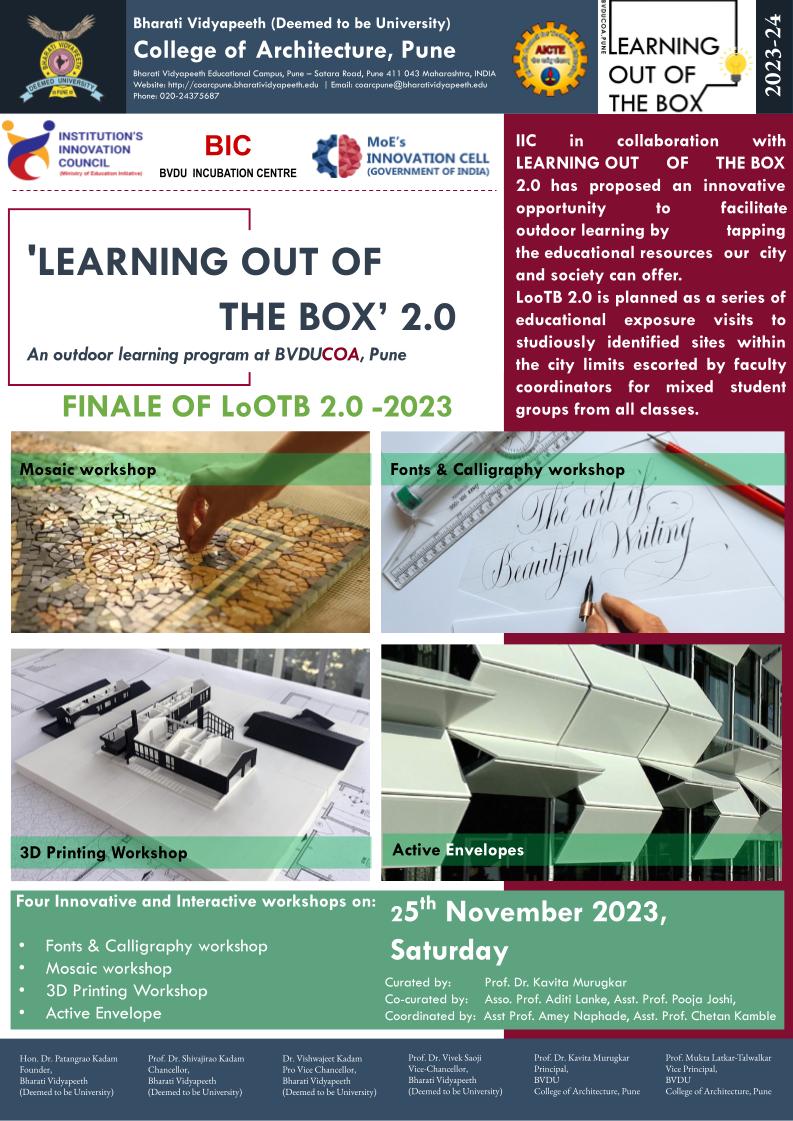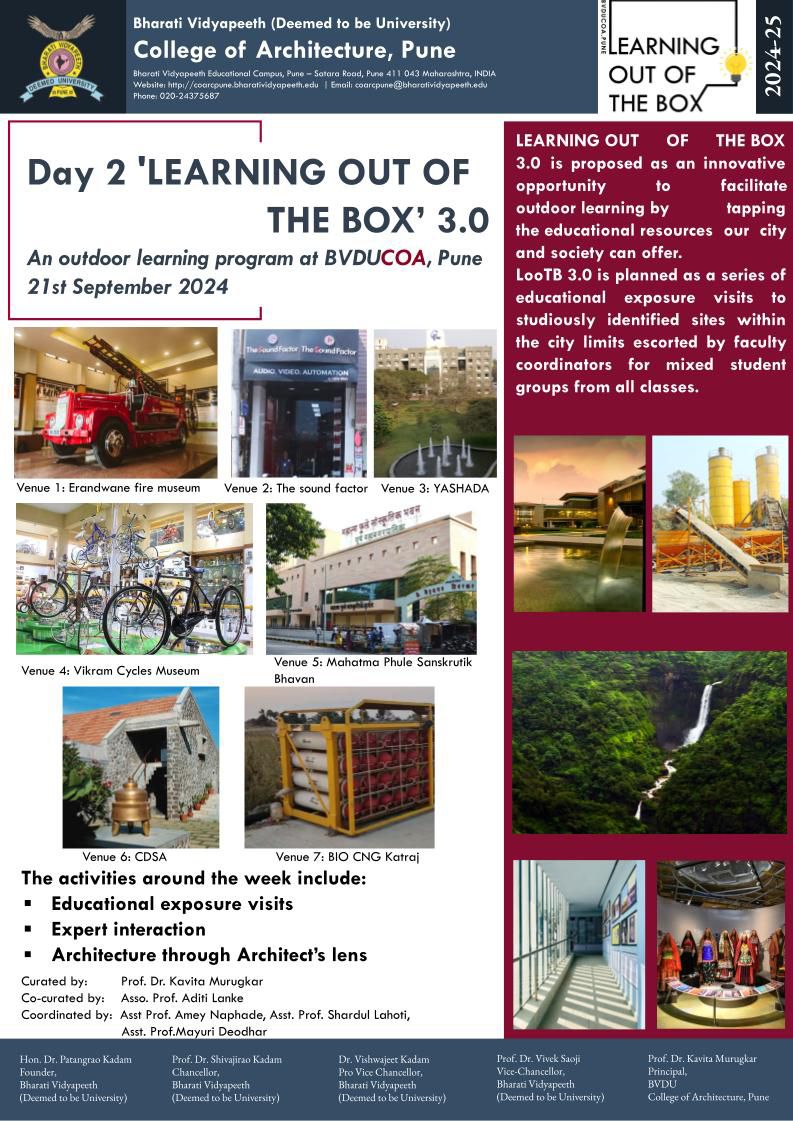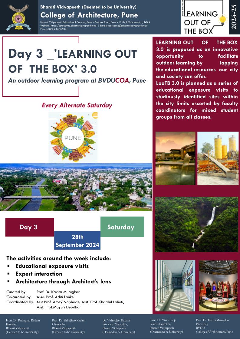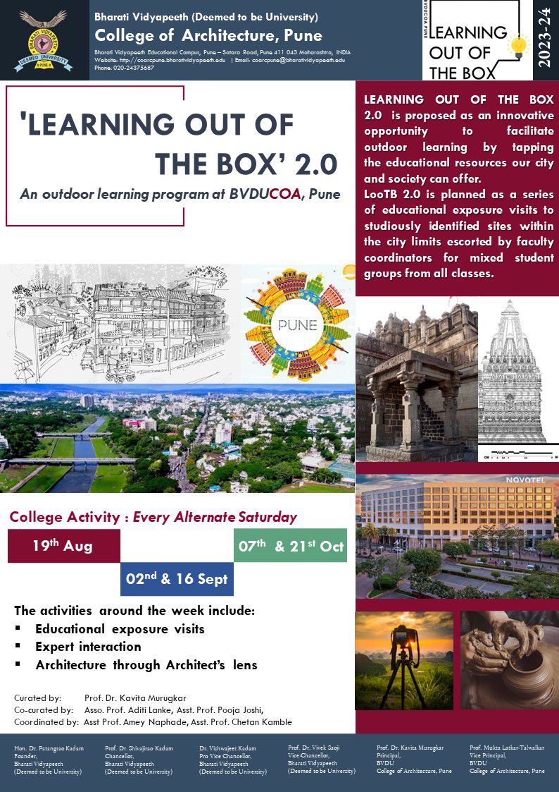 The 5 day event every year is curated as an innovative opportunity for the students of BVDU COA, Pune to facilitate outdoor learning by tapping the educational resources the city and society offers. B.Arch, M.Arch. and Diploma in Arch. students of BVDU COA, Pune enthusiastically participate in a diverse range of activities for enriching their educational experience.