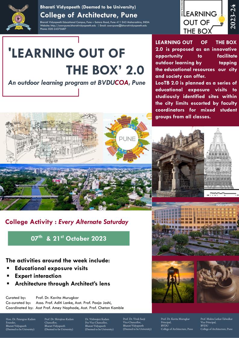 "Learning Out of The Box" (LOotB) is an innovative outdoor learning program that embraces both multidisciplinary and interdisciplinary approaches as a series of educational exposure visits to studiously identified sites within the city limits that are planned to learn more about the city’s architecture, art, heritage, technology, environment and social inclusion through experiential engagement and guided interaction with industry experts.