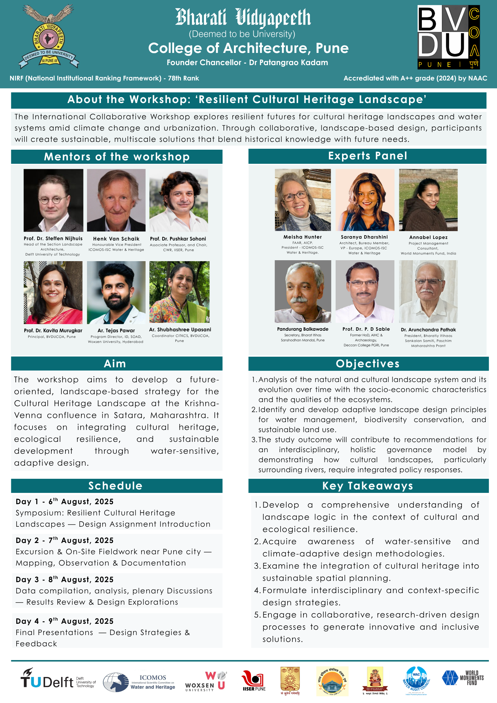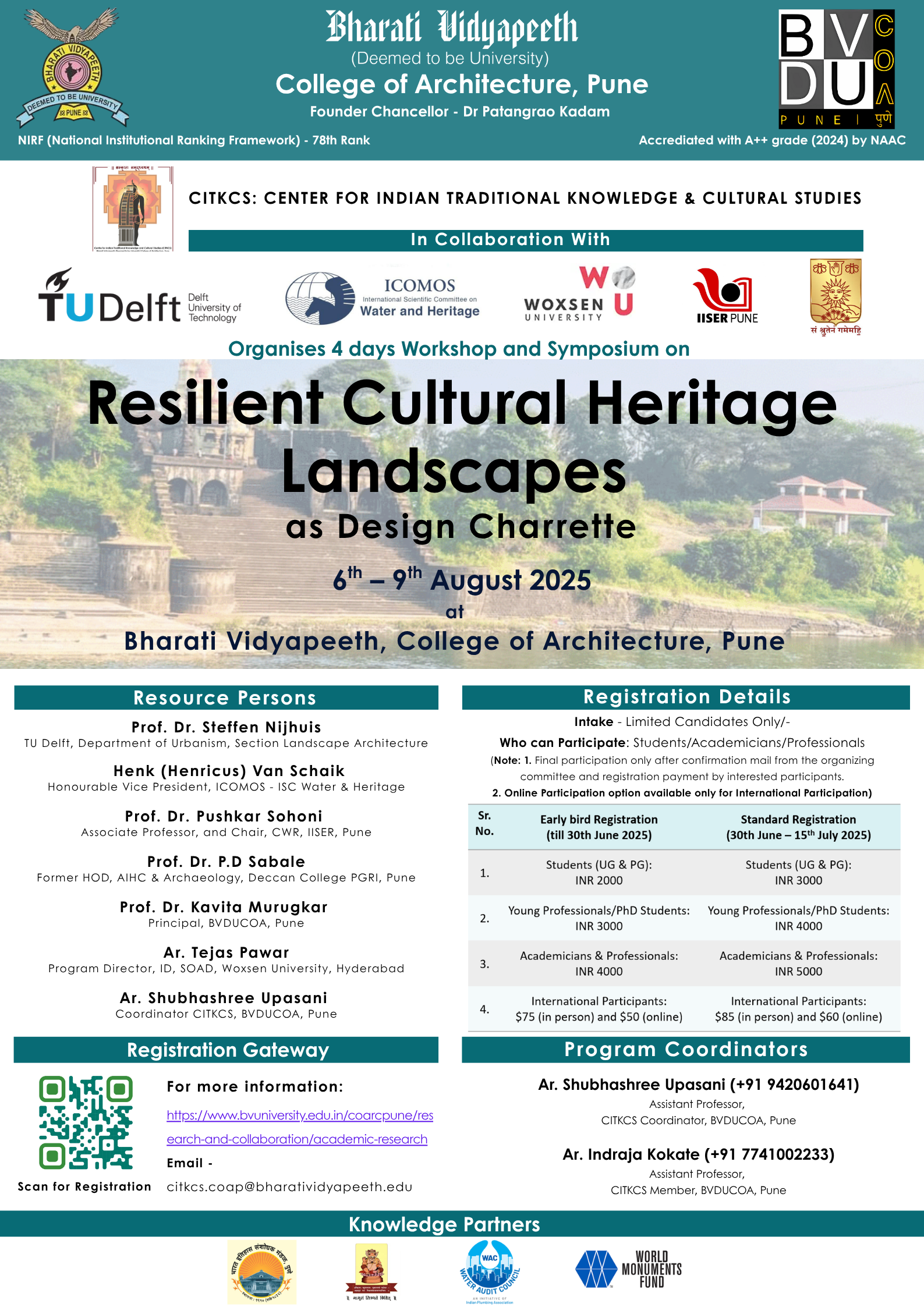 We, the team of CITKCS (Centre for Indian Traditional Knowledge and Cultural Studies ) and IC (International Collaborations) at Bharati Vidyapeeth (Deemed to be University) College of Architecture (BVDUCOA), Pune, are organising an international workshop on Resilient Cultural Heritage Landscapes as a Design Charrette.