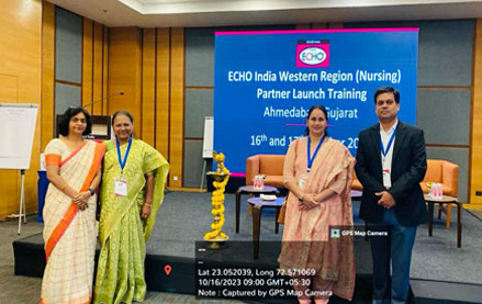Dr. Nilima R Bhore, Dean, Faculty of Nursing & Principal, College of Nursing, Sangli attending ECHO India Western Region (Nursing) Partner Launch Training on 16th October 2023 at Ahmadabad, Gujrat with Dr. Bhagayashree Jogdev, Principal, College of Nursing, Pune, Mrs. Vaishali Jadhav, Principal, College of Nursing, Mumbai and Dr. Suresh Kumar Ray, Vice-Principal, College of Nursing, Pune.