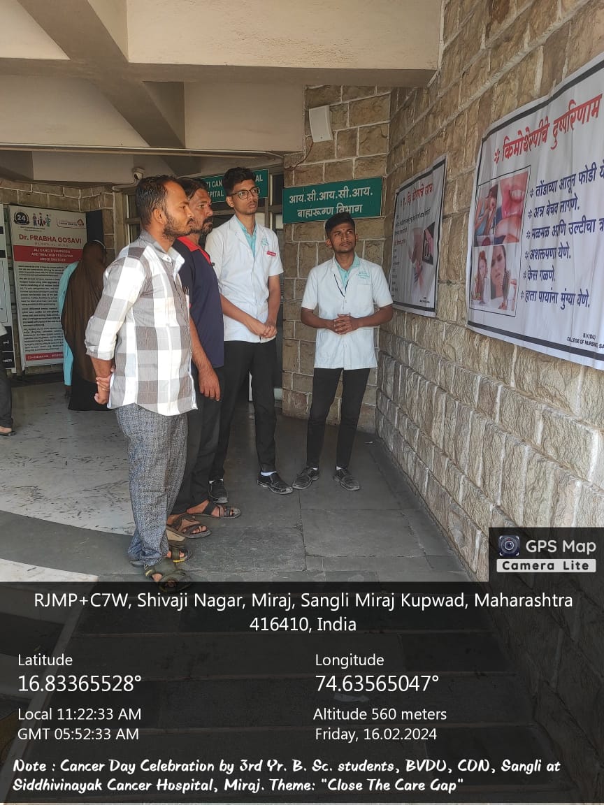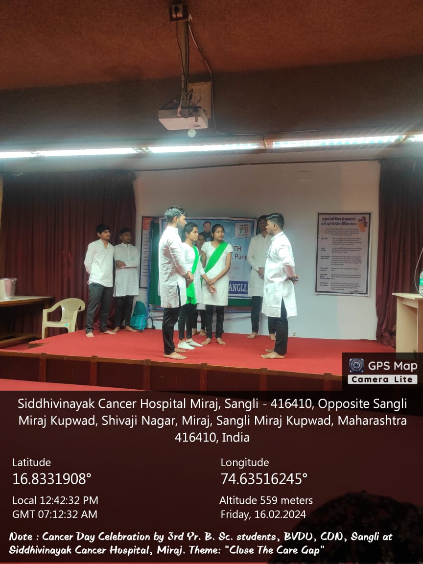 The students of T.Y.B.Sc (N), enacted a role play on Cervical Cancer & displayed posters that provided information about Cancer on 16th Feb. 2024 at Siddhivinayak Cancer Hospital, Miraj. The hospital authorities highly appreciated the college & students for their involvement & efforts taken for the programme.