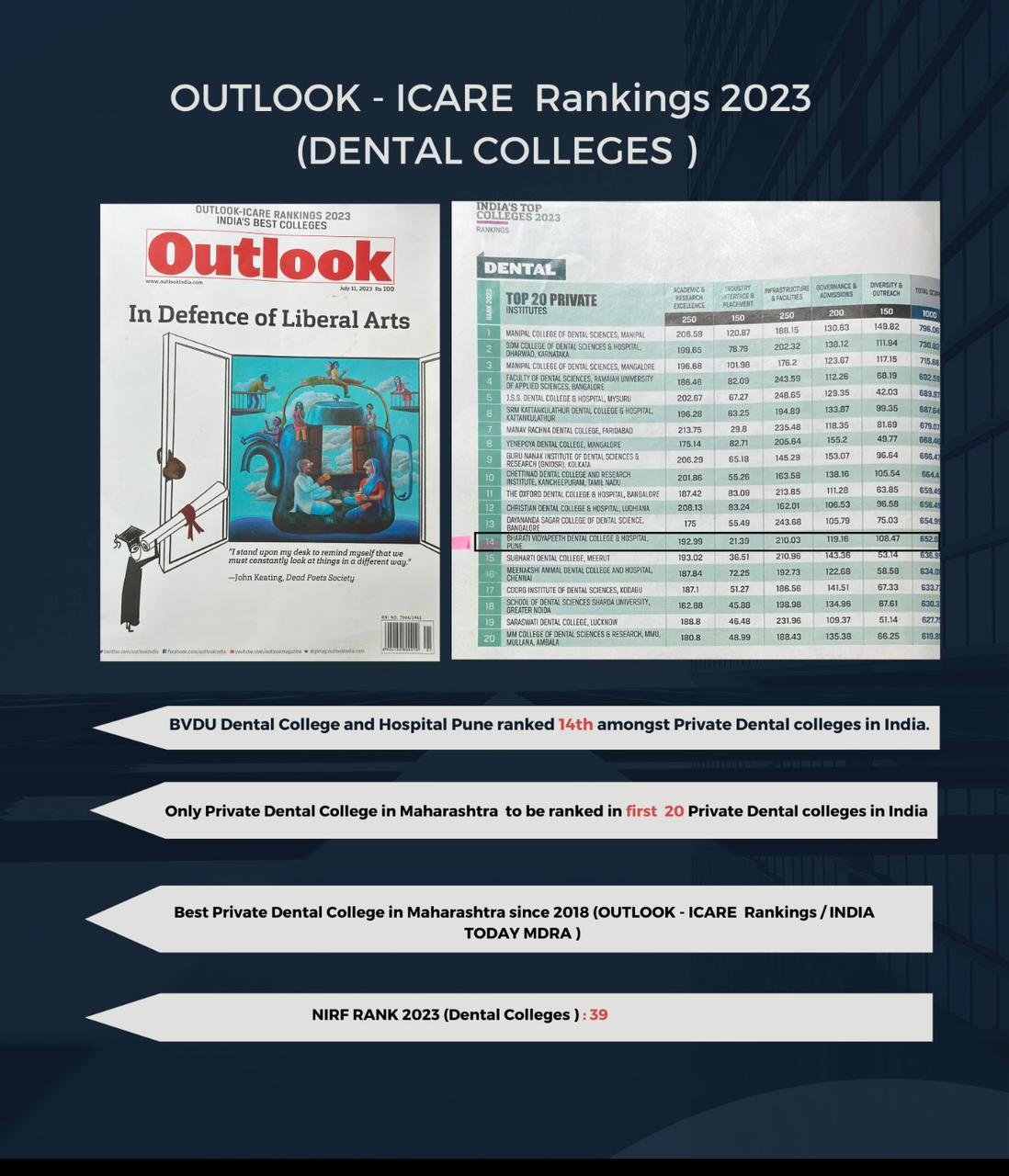 Our College is ranked 12th best dental college in India and the best private college in Maharashtra. (Outlook – MDRA Survey 2010). Our University has been reaccredited with “A+” Grade By National Assessment & Accreditation Council in 2017. Our University has also been awarded ‘A’ Grade by MHRD, Govt. of India. The college tries to achieve its objectives through academic and related activities: teachers create awareness of phenomena and love of learning. Literary events and sports help develop communication skills, leadership qualities, team-spirit and employability. College activities facilitate scientific mindset and a multi-dimensional personality.