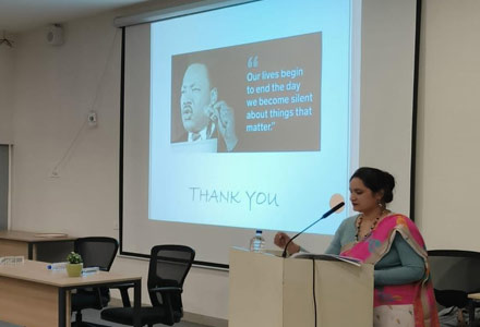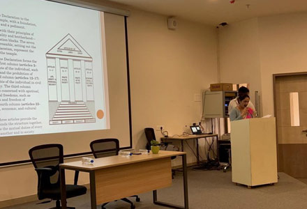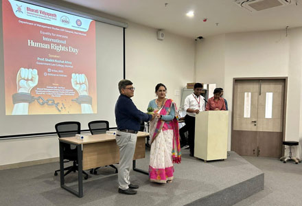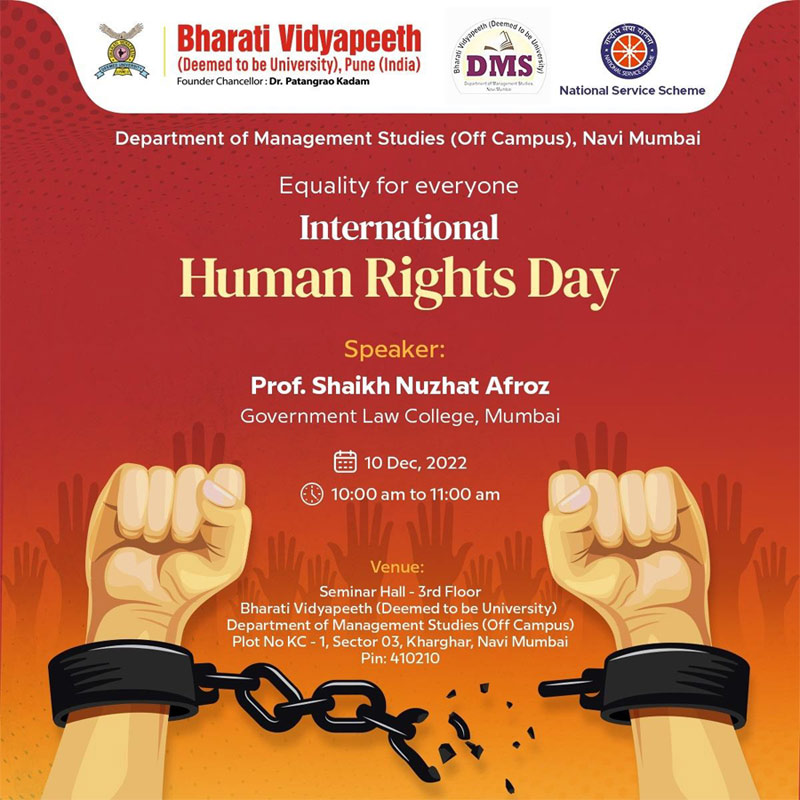 Bharati Vidyapeeth (Deemed to be University) Department of Management Studies (Off Campus) organized a one day event on "International Human Rights Day 2022" on Saturday, 10th December, 2022 from 10:00 am to 11:00 am at Seminar Hall, BV(DU)DMS- Off Campus, Navi Mumbai Kharghar. The International Human Rights Day Celebration concept was planned by Dr. Premasish Roy, Director BV(DU)DMS, The program was initiated with a warm welcome speech by BBA SEM I Students, followed by an inauguration speech by Dr. Premasish Roy and with his inspirational thoughts on the event theme ‘Dignity, Freedom and Justice for all’. The flow of the program moved ahead with small acts played by BBA SEM I enthusiastic students on the theme of Human Rights and concepts like Freedom to speech-equality- live with dignity. And further event started with felicitation to our Guest for this event Mrs. Nuzhat Shaikh, and program continued with her explanation in detail on concepts of Human rights are the foundation for human dignity, and the cornerstone of peaceful, inclusive, fair, equal and prosperous societies through her very informative presentation. This event was well arranged by Prof. Archana B. Sakure-Ubhe, (Assistant Professor, BVDMS). And Dr. Rupali Taru, (Assistant professor, BVDMS, BBA Sem I Program Coordinator) who has coordinated BBA students' presence for this event. Under the guidance of Dr. Premashish Roy this event of International Human Rights Day 2022 was successfully celebrated, where First Year BBA Students and Second year BCA Students of Bharati Vidyapeeth (Deemed to be University), Department of Management Studies (Off Campus), Navi Mumbai who has contributed their volunteers activity throughout this event to made this event grand success. And program concluded with National Anthem.