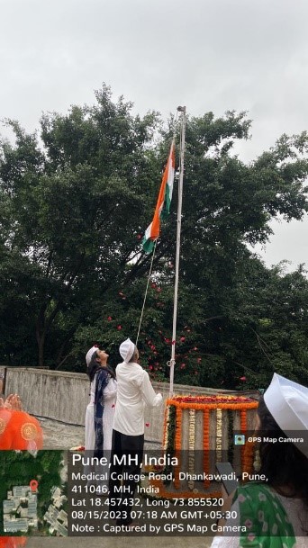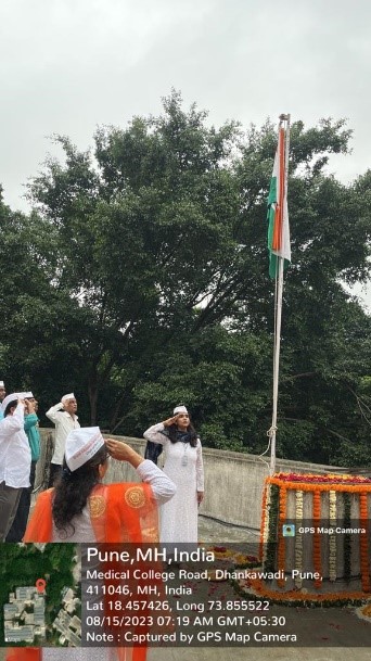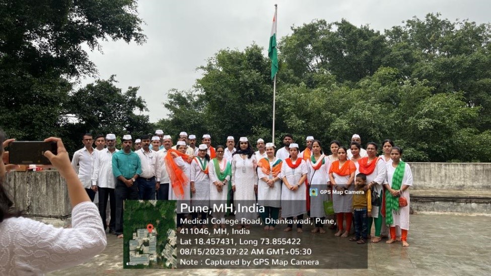 Department of Oral Pathology and Microbiology, celebrated the 77th Indian Independence Day on 15th August 2023, in the institute at 7.15 am. The main event of Independence Day celebration was the hoisting of the Indian National Flag, which was done by Dr. Revati Deshmukh, Head of the Department of Oral Pathology and Microbiology. The flag hoisting was followed by singing of the national anthem, "Jana Gana Mana," an integral part of the celebration. All the gathered Faculty, Auxiliary Staff, Non-teaching Staff and Students sang the anthem with great pride and patriotism. The Interns sang patriotic songs along with melodious music by Dr. Priya Deo on the Synthesizer. This was followed by distribution of sweets amongst all.
