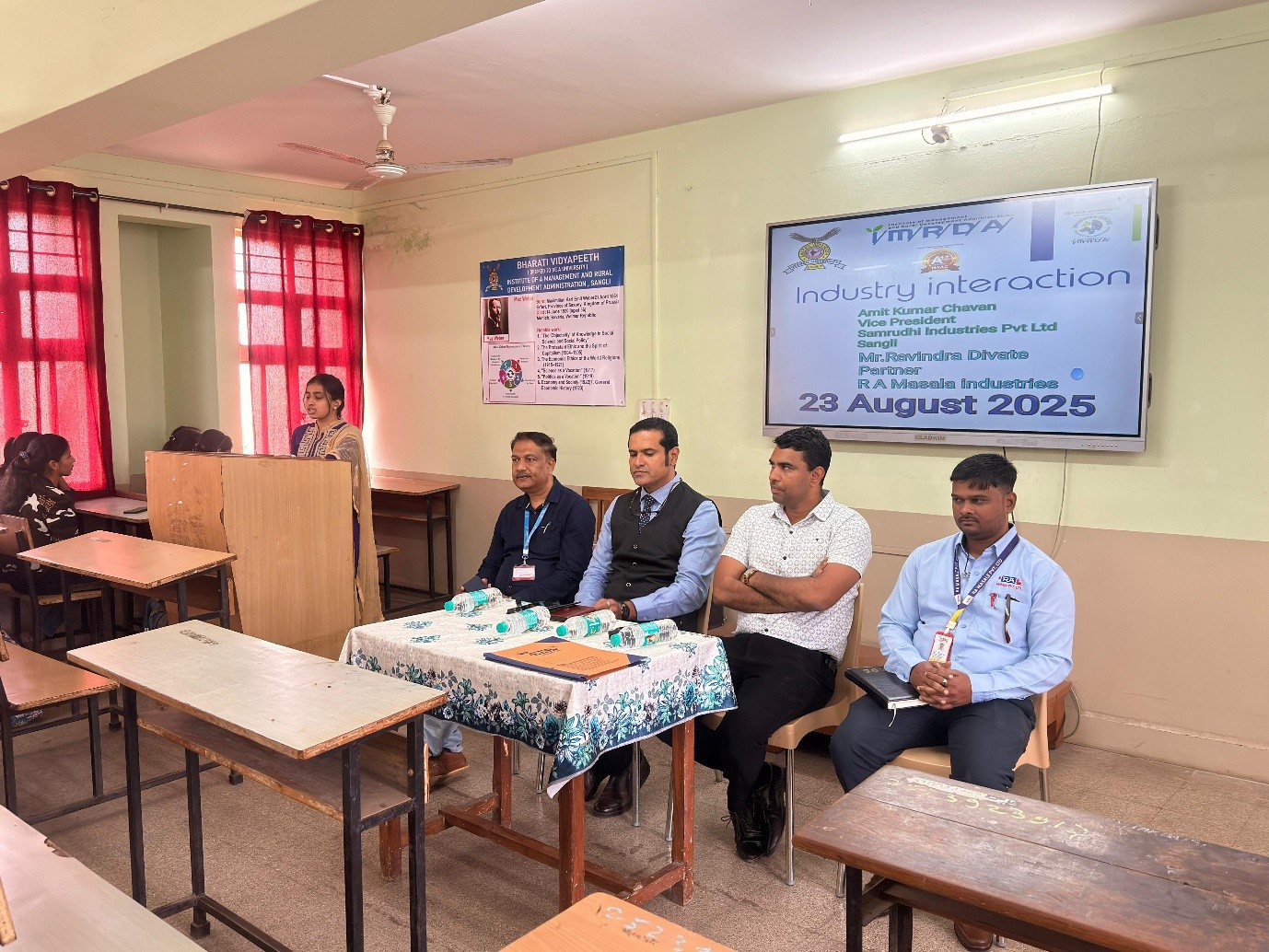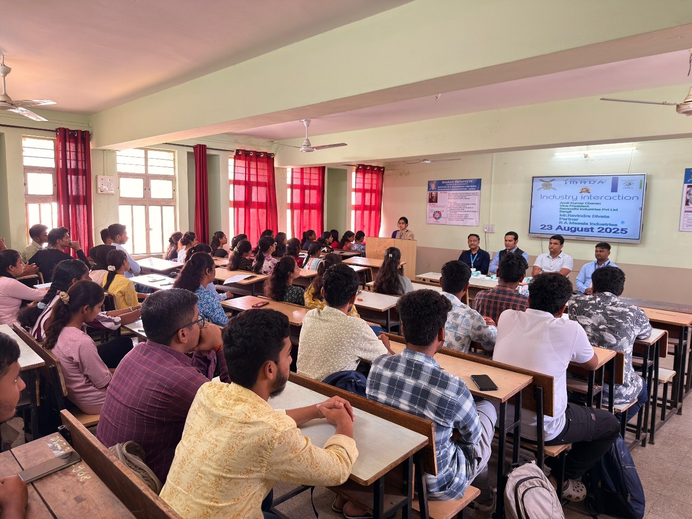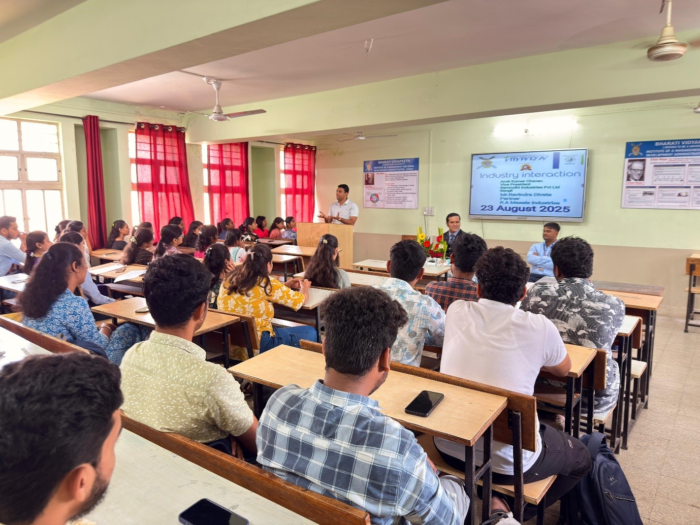 An insightful Industry Interaction Program was organized at the institute on 23rd August 2025. The session aimed at bridging the gap between academia and industry, providing students with practical insights into real-world business practices. The event featured distinguished speakers: Mr. Amit Kumar Chavan, Vice President, Samruddhi Industries Pvt. Ltd., Sangli and Mr. Ravindra Divate, Partner, R.A. Measle Industries.