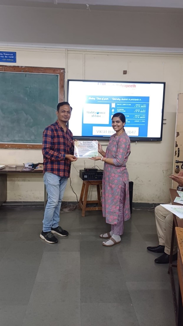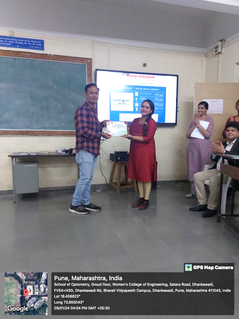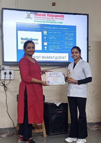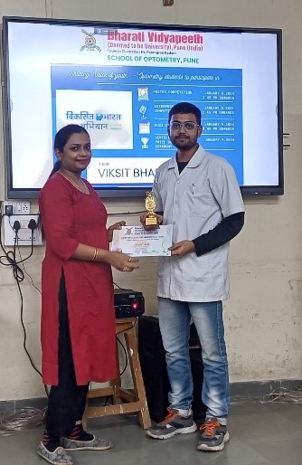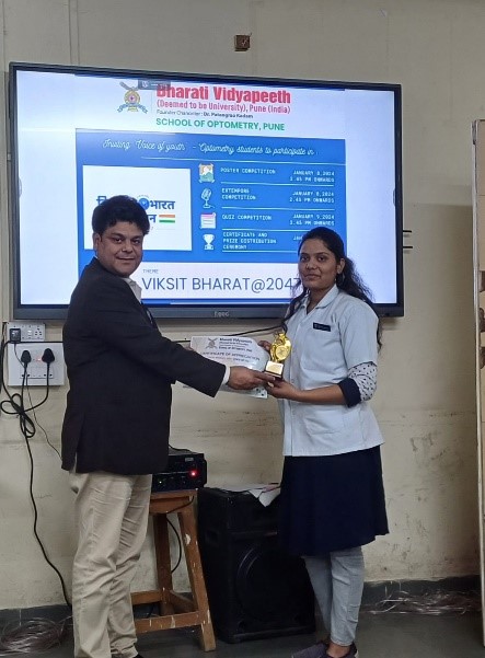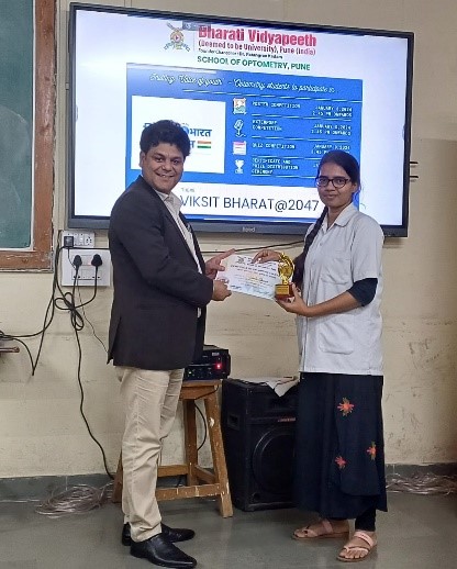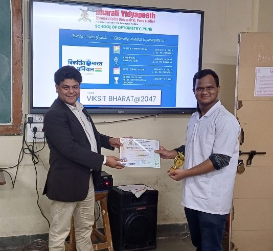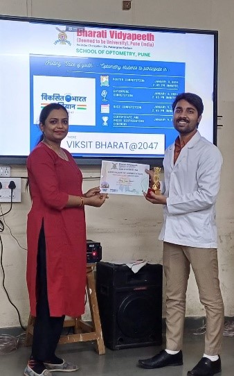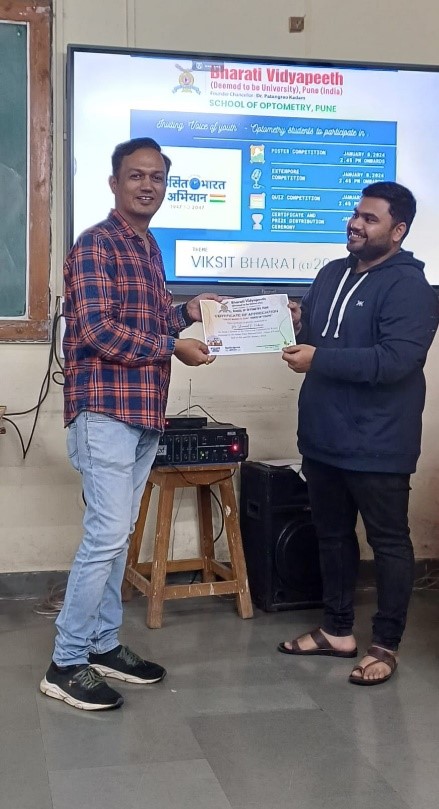 A two-day event on ‘Viksit Bharat@2047: Voice of Youth’ comprising of Poster Competition, Extempore competition on 8th January 2024, and Quiz competition on 9th January 2024 was organized for all the undergraduate and postgraduate students by the faculty of BV(DU) School of Optometry, Pune.